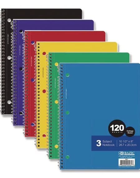 BAZIC® Products Spiral Notebooks, 3 Subjects, Medium/College Rule, Randomly Assorted Cover Colors, (120) 10.5 x 8 Sheets